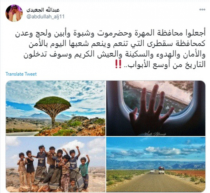 وقال في تغريدة عبر "تويتر" رصدها "المشهد العربي": "أجعلوا محافظة المهرة وحضرموت وشبوة وأبين ولحج وعدن كمحافظة سقطرى التي تنعم وينعم شعبها اليوم بالأمن والأمان والهدوء والسكينة والعيش الكريم وسوف تدخلون التاريخ من أوسع الأبواب".