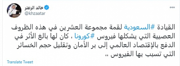 وقال في تغريدة عبر "تويتر" رصدها "المشهد العربي": "القيادة السعودية لقمة مجموعة العشرين في هذه الظروف العصيية التي يشكلها فيروس كورونا ، كان لها بالغ الأثر في الدفع بالإقتصاد العالمي إلى بر الأمان وتقليل حجم الخسائر التي تسبب بها الفيروس".
