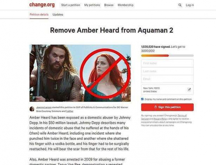 كما أن جمهور جوني ديب العريض لم يتخل عنه كما فعلت شركات الإنتاج، فحصدت العريضة التي دشنها عدد كبير من عشاق جوني على أكثر من 1.5 مليون توقيع من أجل استبعاد زوجته السابقة النجمة العالمية آمبر هيرد، من بطولة فيلمها القادم Aquaman 2.