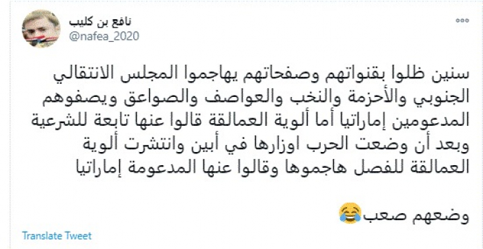 وقال في تغريدة عبر "تويتر" رصدها "المشهد العربي": "سنين ظلوا بقنواتهم وصفحاتهم يهاجموا المجلس الانتقالي الجنوبي والأحزمة والنخب والعواصف والصواعق ويصفوهم المدعومين إماراتيًا أما ألوية العمالقة قالوا عنها تابعة للشرعية وبعد أن وضعت الحرب أوزارها في أبين وانتشرت ألوية العمالقة للفصل هاجموها وقالوا عنها المدعومة إماراتيًا".