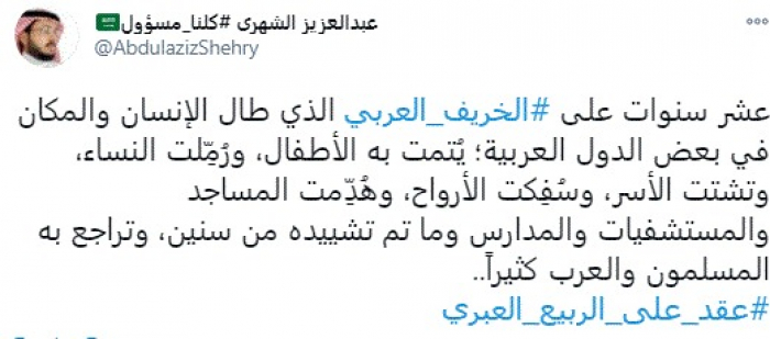 وقال في تغريدة عبر "تويتر" رصدها "المشهد العربي": "عشر سنوات على الخريف العربي الذي طال الإنسان والمكان في بعض الدول العربية؛ يُتمت به الأطفال، ورُمِّلت النساء، وتشتت الأسر، وسُفِكت الأرواح، وهُدِّمت المساجد والمستشفيات والمدارس وما تم تشييده من سنين، وتراجع به المسلمون والعرب كثيراً".
