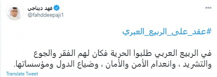 وكتب في تغريدة عبر "تويتر" رصدها "المشهد العربي": "عقد على الربيع العبري.. في الربيع العربي طلبوا الحرية فكان لهم الفقر والجوع والتشريد ، وانعدام الأمن والأمان، وضياع الدول ومؤسساتها".