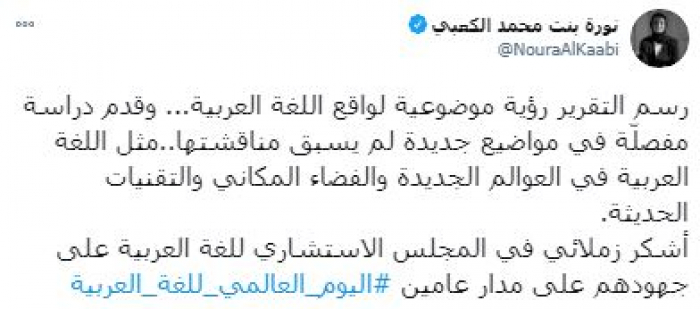 وقالت في تغريدة على حسابها بموقع التدوين المصغر (تويتر)، اليوم إنه: "رسم التقرير رؤية موضوعية لواقع اللغة العربية... وقدم دراسة مفصلّة في مواضيع جديدة لم يسبق مناقشتها".