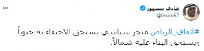 وأكد في تغريدة على حسابه بموقع التدوين المصغر (تويتر) اليوم، أن: "اتفاق الرياض منجز سياسي يستحق الاحتفاء به جنوبًا ويستحق البناء عليه شمالًا".