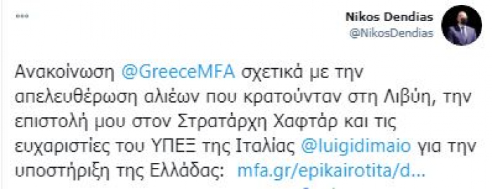 كشف وزير الخارجية اليوناني نيكوس دندياس في تغريدة على حسابه بموقع تويتر اليوم، عن تلقيه رسالة شكر من نظيره الإيطالي بعد وساطة اليونان لدى الجيش الوطني الليبي للإفراج عن بحارة إيطاليين.