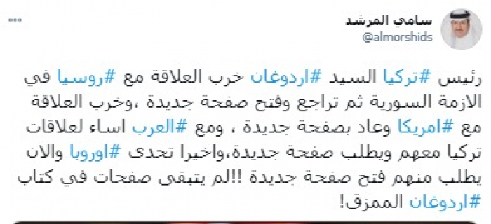 وأشار في تغريدة على حسابه بموقع التدوين المصغر (تويتر)، اليوم، إلى أن: "رئيس تركيا السيد أردوغان خرب العلاقة مع روسيا في الأزمة السورية ثم تراجع وفتح صفحة جديدة، وخرب العلاقة مع أمريكا وعاد بصفحة جديدة، ومع العرب أساء لعلاقات تركيا معهم ويطلب صفحة جديدة، وأخيرا تحدى أوروبا والآن يطلب منهم فتح صفحة جديدة".