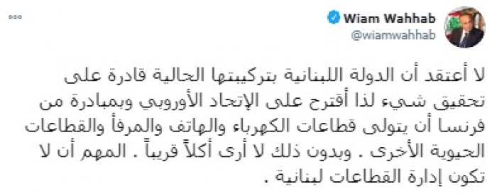 طالب السياسي اللبناني البارز وئام وهاب بإخضاع القطاعات الخدمية في البلاد إلى إدارة دولية، لانتشالها من الانهيار.