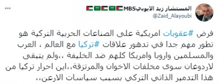وأكد في تغريدة على حسابه بموقع التدوين المصغر (تويتر)، اليوم أن: "فرض عقوبات أمريكية على الصناعات الحربية التركية هو تطور مهم جدا في تدهور علاقات تركيا مع العالم، العرب والمسلمين وأوروبا وأمريكا كلهم ضد الخليفة، ولم يتبقى لأردوغان سوى مخلفات الإخوان والمرتزقة".
