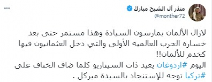 وقال في تغريدة على حسابه بموقع التدوين المصغر (تويتر)، اليوم، إنه: "لازال الألمان يمارسون السيادة وهذا مستمر حتى بعد خسارة الحرب العالمية الأولى والتي دخل العثمانيون فيها كخدم للألمان".
