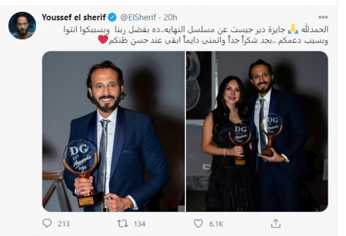وكتب الشريف، عبر حسابه على تويتر، قائلا : "الحمدلله.. جايزة دير جيست عن مسلسل النهاية.. ده بفضل ربنا وبسببكوا انتوا وبسبب دعمكم.. بجد شكراً جداً، وأتمنى دايماً أبقى عند حسن ظنكم".