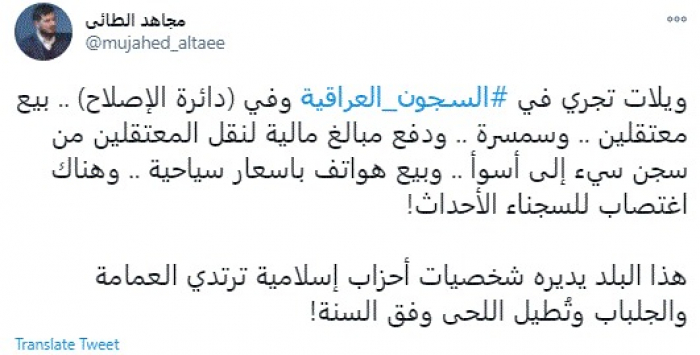 وكتب في تغريدة عبر "تويتر" رصدها "المشهد العربي": "ويلات تجري في السجون العراقية وفي (دائرة الإصلاح) .. بيع معتقلين .. وسمسرة .. ودفع مبالغ مالية لنقل المعتقلين من سجن سيء إلى أسوأ .. وبيع هواتف باسعار سياحية .. وهناك اغتصاب للسجناء الأحداث".