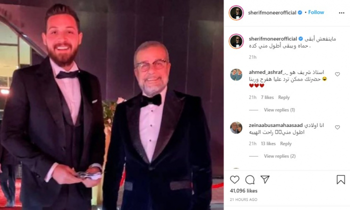 ونشر منير، صورة تجمعه به توضح فرق الطول بينهما، وذلك عبر حسابه على إنستجرام، وعلق: "ما ينفعش أبقى حماه ويبقى أطول مني كده".