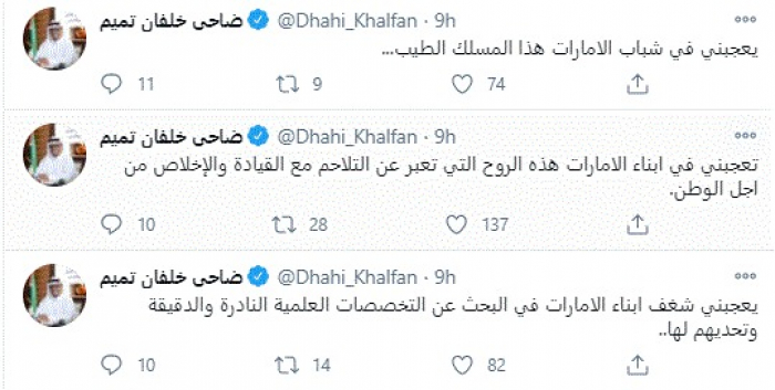 وقال في تغريدات عبر "تويتر" رصدها "المشهد العربي": "يعجبني شغف ابناء الإمارات في البحث عن التخصصات العلمية النادرة والدقيقة وتحديهم لها".