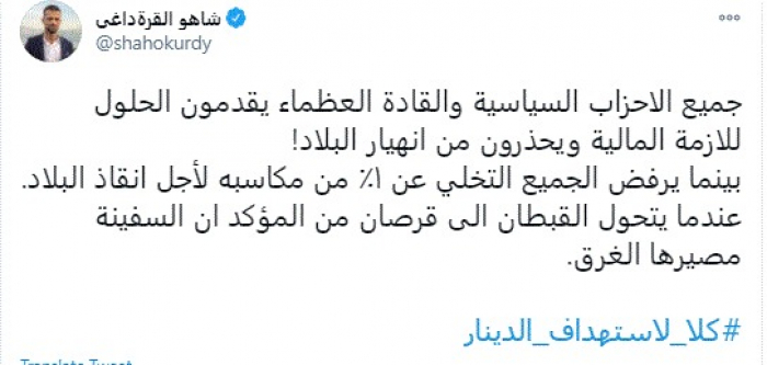 وقال في تغريدة عبر "تويتر" رصدها "المشهد العربي": "جميع الأحزاب السياسية والقادة العظماء يقدمون الحلول للأزمة المالية ويحذرون من انهيار البلاد! بينما يرفض الجميع التخلي عن ١٪ من مكاسبه لأجل إنقاذ البلاد عندما يتحول القبطان الى قرصان من المؤكد ان السفينة مصيرها الغرق. كلا لاستهداف الدينار".