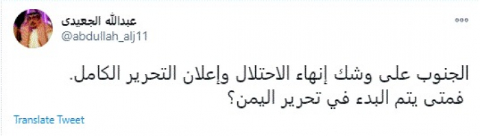 وقال في تغريدة عبر "تويتر" رصدها "المشهد العربي": "الجنوب على وشك إنهاء الاحتلال وإعلان التحرير الكامل".