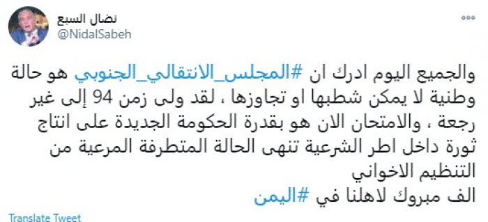 وقال في تغريدة عبر "تويتر" رصدها "المشهد العربي": "والجميع اليوم أدرك أن المجلس الانتقالي الجنوبي هو حالة وطنية لا يمكن شطبها أو تجاوزها، لقد ولى زمن 94 إلى غير رجعة، والامتحان الآن هو بقدرة الحكومة الجديدة على إنتاج ثورة داخل أطر الشرعية تنهى الحالة المتطرفة المرعية من التنظيم الإخواني ألف مبروك لأهلنا في اليمن".