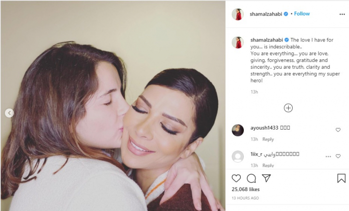 ونشرت شام صورتين تجمعهما، عبر حسابها الرسمي بموقع "إنستجرام"، علقت: "حبي لك لا يوصف، أنت كل شئ، أنت الحب والعطاء والتسامح والسعادة والصدق".