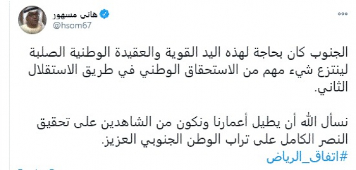 وقال في تغريدة عبر "تويتر" رصدها "المشهد العربي": "الجنوب كان بحاجة لهذه اليد القوية والعقيدة الوطنية الصلبة لينتزع شيء مهم من الاستحقاق الوطني في طريق الاستقلال الثاني".