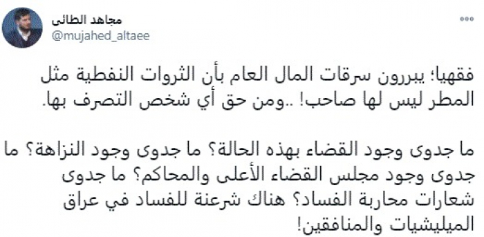 وقال في تغريدة عبر "تويتر" رصدها "المشهد العربي": "فقهيا؛ يبررون سرقات المال العام بأن الثروات النفطية مثل المطر ليس لها صاحب! ..ومن حق أي شخص التصرف بها. ما جدوى وجود القضاء بهذه الحالة؟ ما جدوى وجود النزاهة؟ ما جدوى وجود مجلس القضاء الأعلى والمحاكم؟ ما جدوى شعارات محاربة الفساد؟ هناك شرعنة للفساد في عراق الميليشيات والمنافقين".