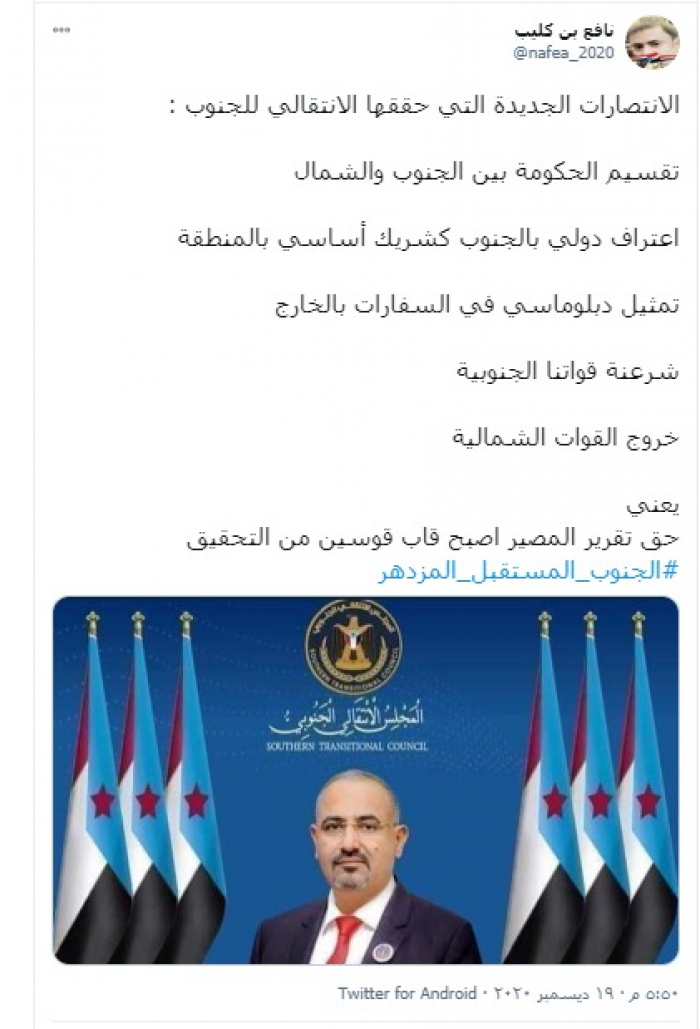 وكتب "بن كُليب" تغريدة عبر حسابه بتويتر، رصدها "المشهد العربي": "الانتصارات الجديدة التي حققها الانتقالي للجنوب: