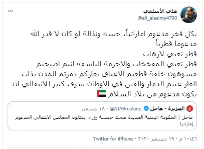 قصف الناشط السياسي علي الأسلمي، جبهة بوق قطر الإرهابية "الجزيرة" التي تبث السموم وتنشر الفتن، مبرزًا أوجه الإرهاب القطري، مشيدًا في الوقت ذاته بدور دولة الإمارات في نشر السلام بالمنطقة وخاصة في دعم المجلس الانتقالي الجنوبي.