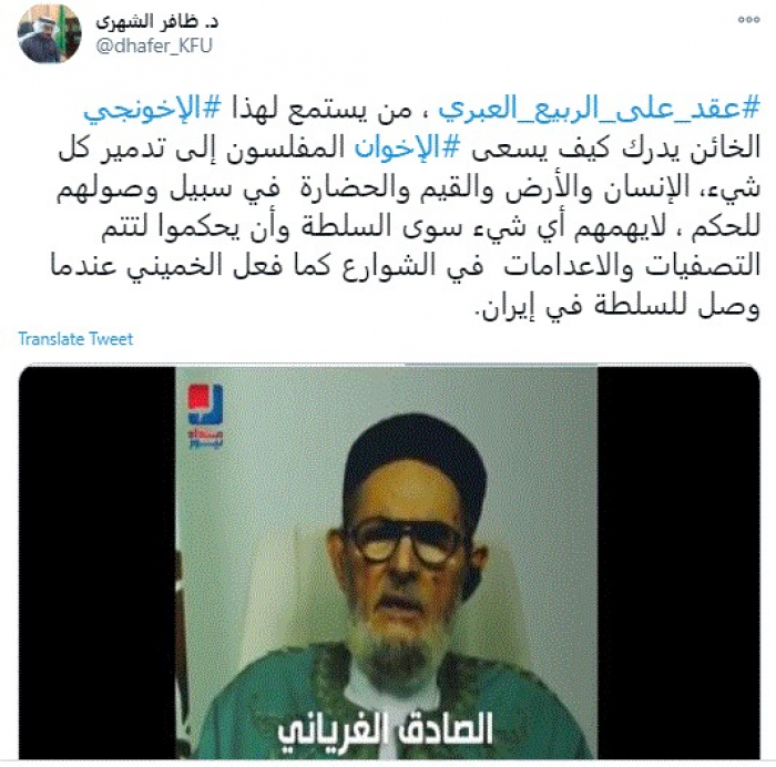 استنكر السياسي السعودي الدكتور ظافر الشهري، اليوم، الدعوات التي أطلقها مفتي الدم والإرهاب الإخواني الصادق الغرياني بالتحريض على الحرب في ليبيا ودعم الاحتلال التركي.