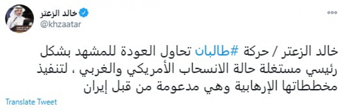 وكتب في تغريدة عبر "تويتر" رصدها "المشهد العربي": "حركة طالبان تحاول العودة للمشهد بشكل رئيسي مستغلة حالة الانسحاب الأمريكي والغربي ، لتنفيذ مخططاتها الإرهابية وهي مدعومة من قبل إيران".