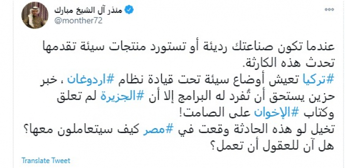 وكتب في تغريدة عبر "تويتر" رصدها "المشهد العربي": "عندما تكون صناعتك رديئة أو تستورد منتجات سيئة تقدمها تحدث هذه الكارثة. تركيا تعيش أوضاع سيئة تحت قيادة نظام أردوغان ، خبر حزين يستحق أن تُفرد له البرامج إلا أن الجزيرة لم تعلق وكتاب الإخوان على الصامت".
