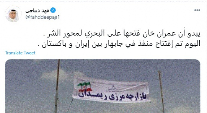 وقال في تغريدة عبر "تويتر" رصدها "المشهد العربي": "يبدو أن عمران خان فتحها على البحري لمحور الشر. اليوم تم إفتتاح منفذ في جابهار بين إيران وباكستان".