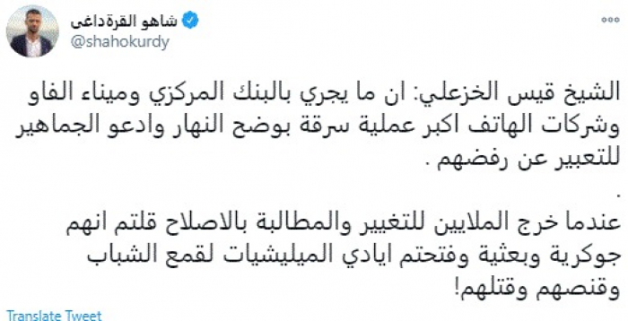 وقال في تغريدة عبر "تويتر" رصدها "المشهد العربي": "الشيخ قيس الخزعلي: ان ما يجري بالبنك المركزي وميناء الفاو وشركات الهاتف اكبر عملية سرقة بوضح النهار وادعو الجماهير للتعبير عن رفضهم. عندما خرج الملايين للتغيير والمطالبة بالاصلاح قلتم انهم جوكرية وبعثية وفتحتم أيادي الميليشيات لقمع الشباب وقنصهم وقتلهم".