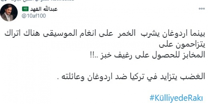 وكتب في تغريدة عبر "تويتر" رصدها "المشهد العربي": "بينما أردوغان يشرب الخمر على أنغام الموسيقى هناك أتراك يتزاحمون على المخابز للحصول على رغيف خبز.. الغضب يتزايد في تركيا ضد أردوغان وعائلته".