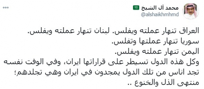 وكتب في تغريدة عبر "تويتر" رصدها "المشهد العربي": "العراق تنهار عملته ويفلس. لبنان تنهار عملته ويفلس. سوريا تنهار عملتها وتفلس. اليمن تنهار عملته ويفلس. وكل هذه الدول تسيطر على قراراتها إيران، وفي الوفت نفسه تجد أناس من تلك الدول يمجدون في ايران وهي تجلدهم؛ منتهى الذل والخنوع".
