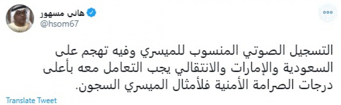 وقال في تغريدة عبر "تويتر" رصدها "المشهد العربي": "التسجيل الصوتي المنسوب للميسري وفيه تهجم على السعودية والإمارات والانتقالي يجب التعامل معه بأعلى درجات الصرامة الأمنية فلأمثال الميسري السجون".