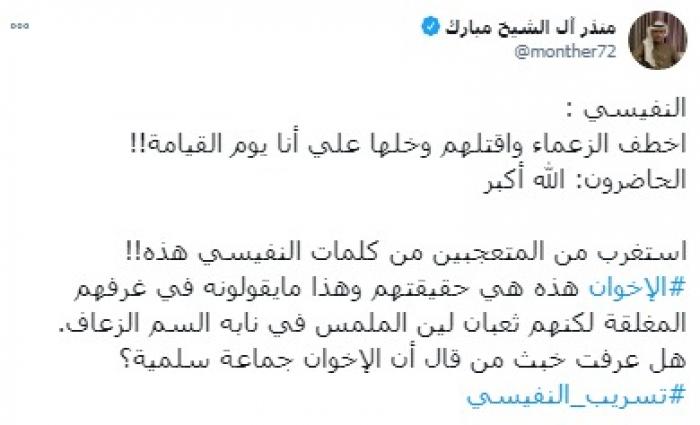 واستعرض في تغريدة على حسابه بموقع التدوين المصغر (تويتر)، جانبا من مقطع فيديو مسرب للنفيسي قال فيه: "اخطف الزعماء واقتلهم وخلها علي أنا يوم القيامة!!، والحاضرون: الله أكبر".