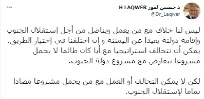 وشدد في تغريدة على حسابه بموقع التدوين المصغر (تويتر)، اليوم على أنه: "ليس لنا خلاف مع من يعمل ويناضل من أجل استقلال الجنوب وإقامة دولته بعيدا عن اليمننة وإن اختلفنا في اختيار الطريق".