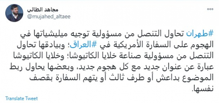وكتب في تغريدة عبر "تويتر" رصدها "المشهد العربي": "طهران تحاول التنصل من مسؤولية توجيه ميليشياتها في الهجوم على السفارة الأمريكية في العراق؛ وبيادقها تحاول التنصل من مسؤولية صناعة خلايا الكاتيوشا؛ وخلايا الكاتيوشا عبارة عن عنوان جديد مع كل هجوم جديد، وبعضها يحاول ربط الموضوع بداعش أو طرف ثالث أو يتهم السفارة بقصف نفسها".