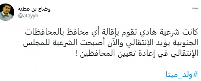 وقال في تغريدة عبر "تويتر" رصدها "المشهد العربي": "كانت شرعية هادي تقوم بإقالة أي محافظ بالمحافظات الجنوبية يؤيد الانتقالي والآن أصبحت الشرعية للمجلس الانتقالي في إعادة تعيين المحافظين".