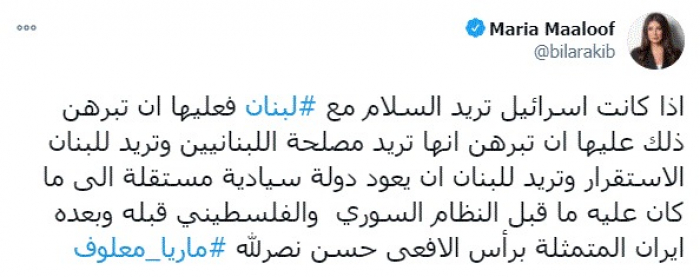 وقالت في تغريدة عبر "تويتر" رصدها "المشهد العربي": "إذا كانت إسرائيل تريد السلام مع لبنان فعليها أن تبرهن ذلك عليها أن تبرهن أنها تريد مصلحة اللبنانيين وتريد للبنان الاستقرار وتريد للبنان أن يعود دولة سيادية مستقلة إلى ما كان عليه ما قبل النظام السوري والفلسطيني قبله وبعده إيران المتمثلة برأس الافعى حسن نصرالله".