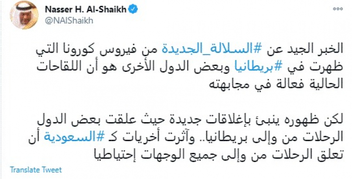 وكتب في تغريدة عبر "تويتر" رصدها "المشهد العربي": "الخبر الجيد عن السلالة الجديدة من فيروس كورونا التي ظهرت في بريطانيا وبعض الدول الأخرى هو أن اللقاحات الحالية فعالة في مجابهته لكن ظهوره ينبئ بإغلاقات جديدة حيث علقت بعض الدول الرحلات من وإلى بريطانيا.. وآثرت أخريات كـ السعودية أن تعلق الرحلات من وإلى جميع الوجهات إحتياطيا".