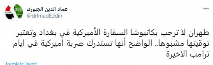 وقال في تغريدة عبر "تويتر" رصدها "المشهد العربي": "طهران لا ترحب بكاتيوشا السفارة الأميركية في بغداد وتعتبر توقيتها مشبوها.. الواضح أنها تستدرك ضربة أميركية في أيام ترامب الاخيرة".