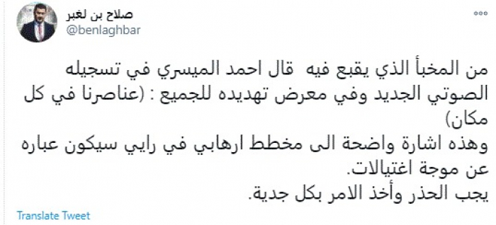 حذر الإعلامي صلاح بن لغبر، اليوم، من المخططات الإرهابية وذلك بعد التسريب الأخير المنسوب للمدعو أحمد الميسري.