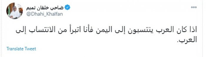 وقال في تغريدة عبر "تويتر" رصدها "المشهد العربي": "إذا كان العرب ينتسبون إلى اليمن فأنا اتبرأ من الانتساب إلى العرب".