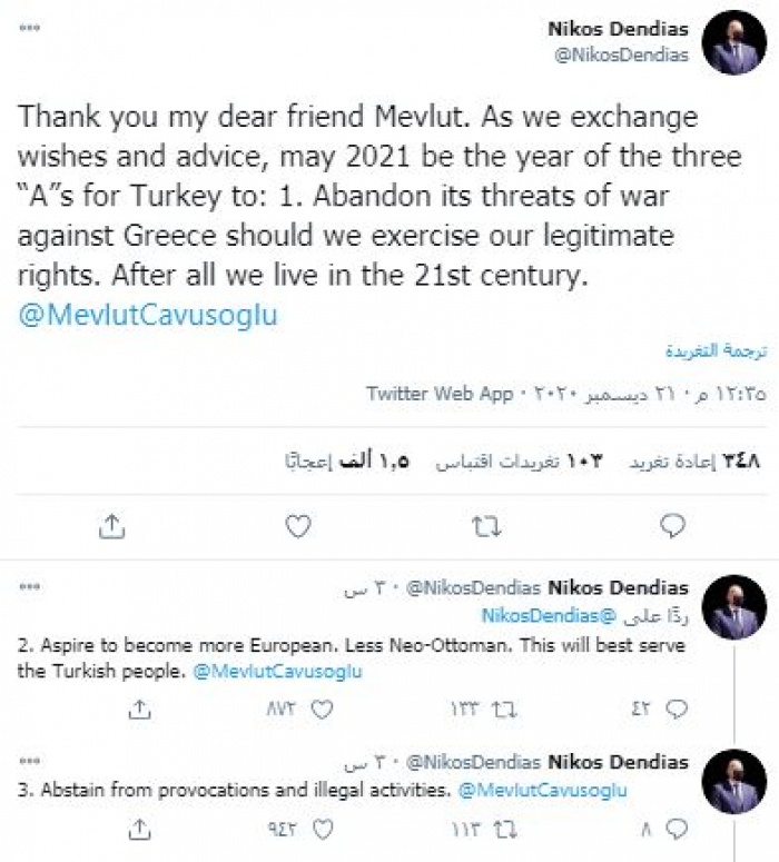 وقال في تغريدة على حسابه بموقع التدوين المصغر (تويتر)، اليوم إنه: "قد يكون عام 2021 عام "الألفيات" الثلاثة لتركيا من أجل التخلي عن تهديداتها بالحرب ضد اليونان إذا مارسنا حقوقنا المشروعة".