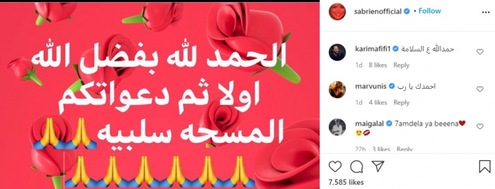 وكتبت صابرين، عبر حسابها على إنستجرام: "الحمد لله .. بفضل الله أولاً ثم دعواتكم .. المسحة سلبية".