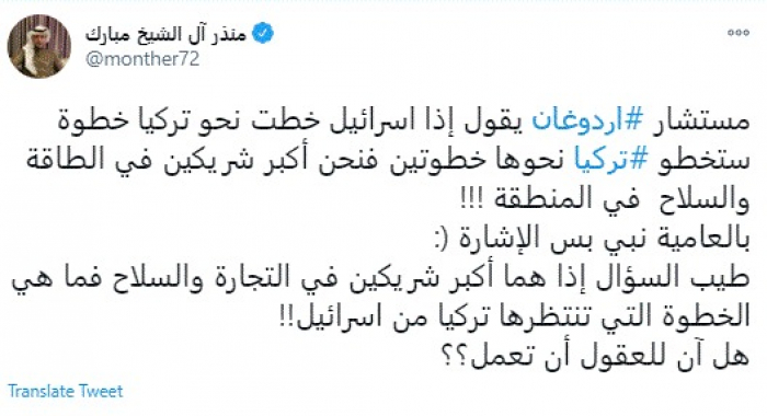 وقال في تغريدة عبر "تويتر" رصدها "المشهد العربي": "مستشار أردوغان يقول إذا اسرائيل خطت نحو تركيا خطوة ستخطو تركيا نحوها خطوتين فنحن أكبر شريكين في الطاقة والسلاح في المنطقة !!! بالعامية نبي بس الإشارة (: طيب السؤال إذا هما أكبر شريكين في التجارة والسلاح فما هي الخطوة التي تنتظرها تركيا من اسرائيل!! هل آن للعقول أن تعمل؟؟".