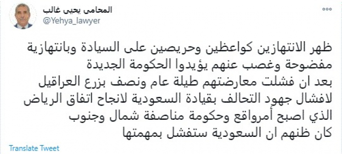 قال الناشط السياسي المحامي يحيى غالب، اليوم، إن اتفاق الرياض أصبح أمرًا واقعًا بعد الإعلان عن حكومة المناصفة.