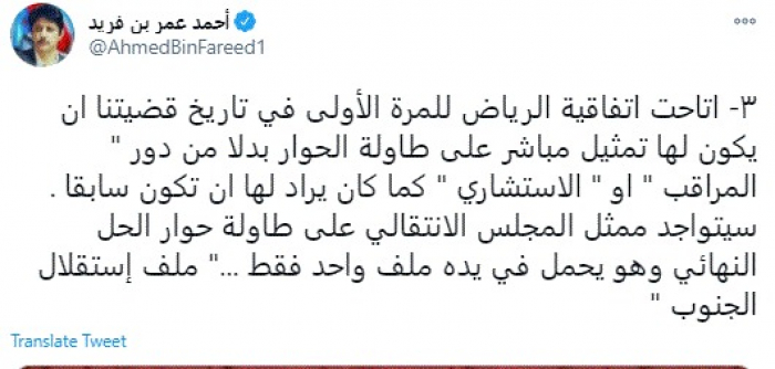 وأوضح: "أتاحت اتفاقية الرياض للمرة الأولى في تاريخ قضيتنا أن يكون لها تمثيل مباشر على طاولة الحوار بدلًا من دور المراقب أو الاستشاري كما كان يراد لها أن تكون سابقًا. سيتواجد ممثل المجلس الانتقالي على طاولة حوار الحل النهائي وهو يحمل في يده ملف واحد فقط ملف استقلال الجنوب".