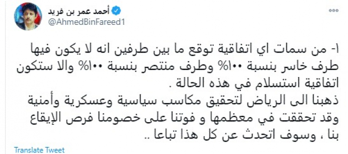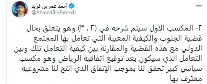 وأضاف: "المكسب الأول سيتم شرحه في (2 ، 3) وهو يتعلق بحال قضية الجنوب والكيفية المعيبة التي تعامل بها المجتمع الدولي مع هذه القضية والمقارنة بين كيفية التعامل تلك وبين التعامل الذي سيكون بعد توقيع اتفاقية الرياض وهو مكسب سياسي كبير تحقق لنا بموجب الاتفاق الذي أنتج لنا مشروعية معترف بها".