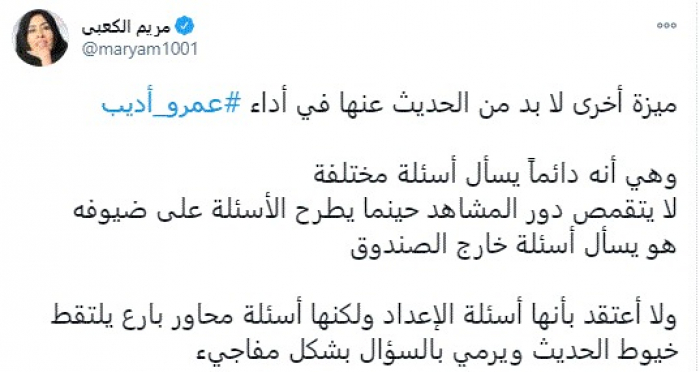 وقالت في تغريدة عبر "تويتر" رصدها "المشهد العربي": "ميزة أخرى لا بد من الحديث عنها في أداء عمرو أديب وهي أنه دائماً يسأل أسئلة مختلفة لا يتقمص دور المشاهد حينما يطرح الأسئلة على ضيوفه هو يسأل أسئلة خارج الصندوق ولا اعتقد بأنها أسئلة الإعداد ولكنها أسئلة محاور بارع يلتقط خيوط الحديث ويرمي بالسؤال بشكل مفاجيء".