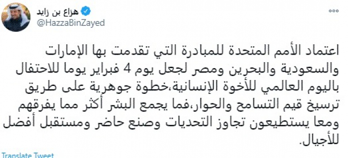 أشاد نائب رئيس المجلس التنفيذي لإمارة أبوظبي الشيخ هزاع بن زايد، اليوم، تبني الجمعية العامة للأمم المتحدة في نيويورك، القرار الخاص الذي قدمته كل من السعودية والإمارات والبحرين ومصر، بإعلان 4 فبراير من كل عام ليكون "اليوم العالمي للأخوة الإنسانية".